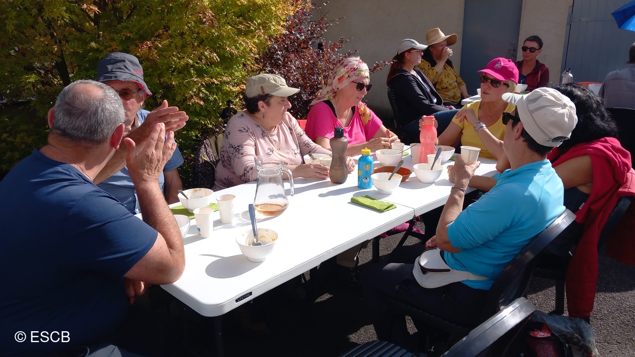 Une belle journée ensoleillée a permis à tous les marcheurs de profiter pleinement du circuit pédestre dans notre belle vallée. Un accueil convivial avec une table de présentation de livres de cuisine (surtout des soupes) dans un décor automnal, et autour d'un petit déjeuner traditionnel : (café, lait, chocolat, thé... avec tartines de pain de campagne et confitures "maison" ) et c'est le départ direction Viger, et la première halte à l'ancienne mairie, avec un délicieux velouté de carottes au curcuma, précédé d'une chorale improvisée sur le thème du boire et du manger. Ensuite, descente sur Ossen, puis direction Ségus pour la deuxième halte au Point Accueil (café Le C'Gus) où un copieux dhal attendait les randonneurs - qui ont quand même dû résoudre quelques énigmes et devinettes, pas toujours évidentes, avant de pouvoir se rassasier - Et enfin le retour vers Barlongue par le chemin du Houssat, et la boucle était bouclée ! Heureusement pour les "un peu fatigués", la table était mise pour la dernière "soupe" légèrement sucrée et d'une belle couleur (potiron, orange) un vrai dessert ! accompagné de gâteau, puis de café ou de thé.